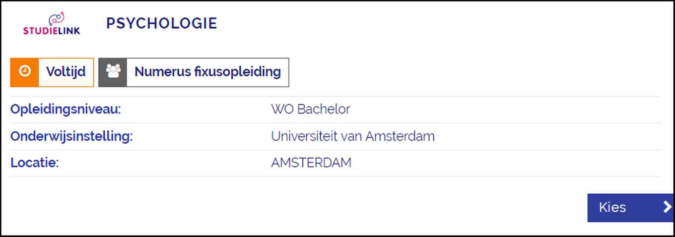 Wat als je straks niet door de selectieprocedure voor Psychologie komt? Zog voor een plan B en oriënteer je alvast op andere studies op het gebied van gedrag. Je kunt je voor twee studies tegelijk inschrijven. Word je niet geselecteerd voor Psychologie, dan sta je alvast ingeschreven voor een andere studie.